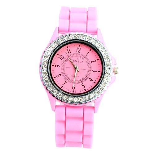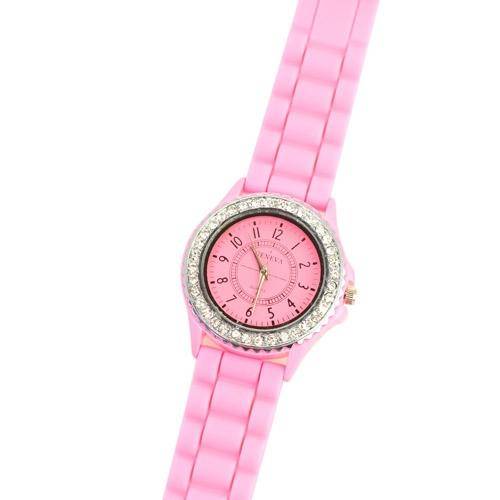Rhinestone Quartz Movement Watch With Silicone Band - Pink