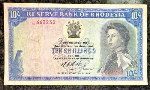 RHODESIA 10 SHILLINGS 1ST JUNE 1966 SALISBURY C.J. RHODES WATERMARK