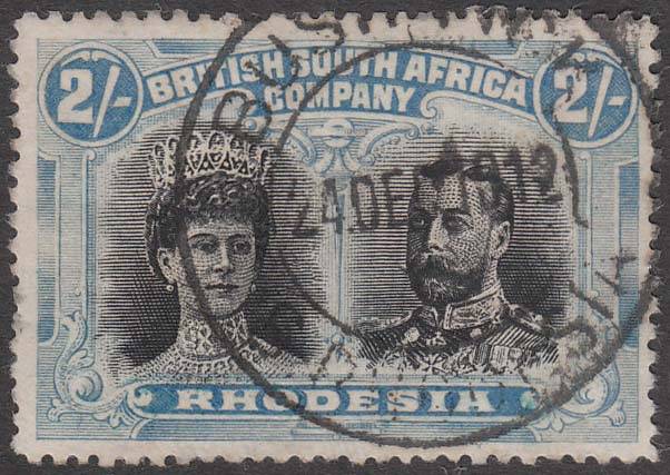Rhodesia 1910 Double Heads 2/- black and dull blue shade with Bushtick postmark fine used. Condition as per scan(s) which form part of the description.