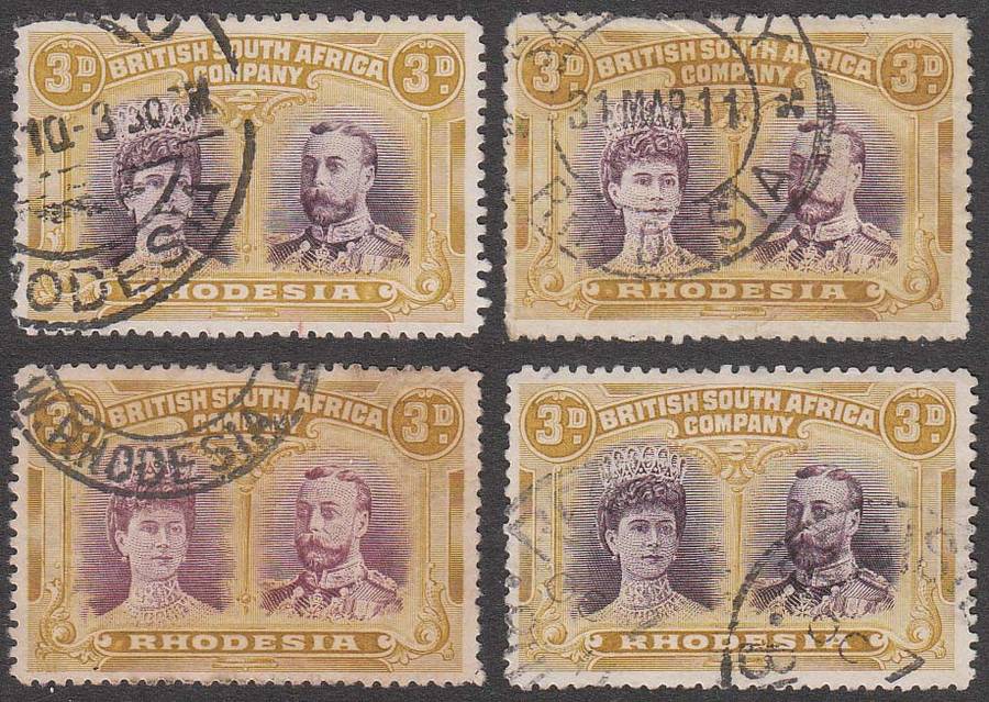 Rhodesia 1910 Double Heads 3d the four listed shades including the difficult to find violet and ochre. Condition as per scan(s) which form part of the description.