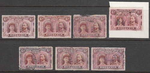 Rhodesia 1910 Double Heads 6d MM plus used / fiscal range, the 3rd stamp top row (faulty corner) has the Thick ear variety, the last two stamps bottom row are perf 15. Imperfections and condition as per scans