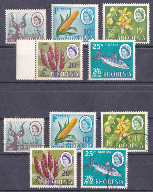 RHODESIA, full sets 1967 duel currency, mint not hinged and used previously hinged, view scans for condition as it form part of the description, Note, display card not included and light browning of gum some stamps.