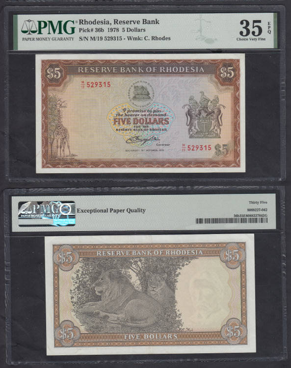 Rhodesia 5 Dollars 20 October 1978 (PMG 35 Choice Very Fine)