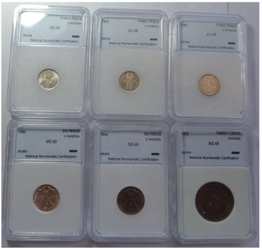 Rhodesia: Silver Tickey (3d) 1946: NNC AU-58 (capsule small crack) |