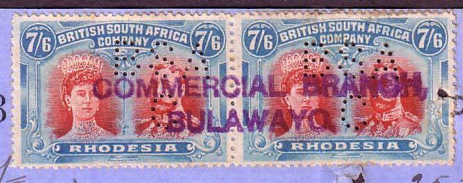 BSAC Rhodesia 1914 (July 25) Double Heads 7/6d carmine & light blue shade pair, left stamp showing Gash in ear variety used on Quitrent receipt tied BSAC perfins and Commercial Branch Salisbury cancel. Usual pinholes through document plus through right stamp. Rare and perhaps unique. See scans.
