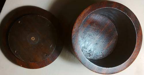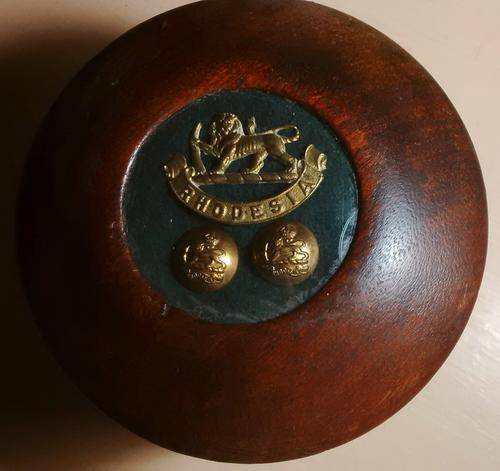RHODESIA TOBACCO JAR /CONTAINER~ CAP BADGE AND 2 BUTTONS ON GREEN FELT~UNDER GLASS