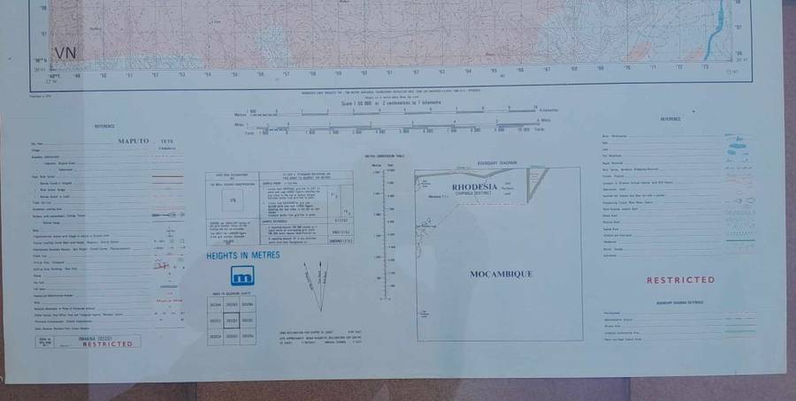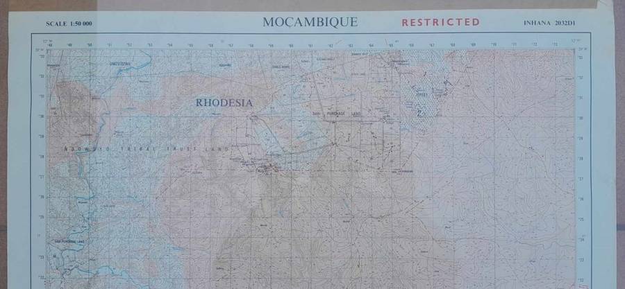 Rhodesia-printed RESTRICTED    INHANA (Mozambique)   wall map. Size is 80cm x 60cm. Very good condition.