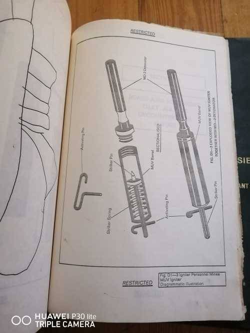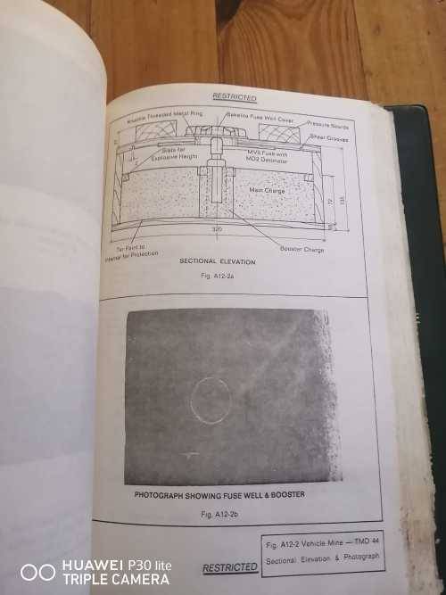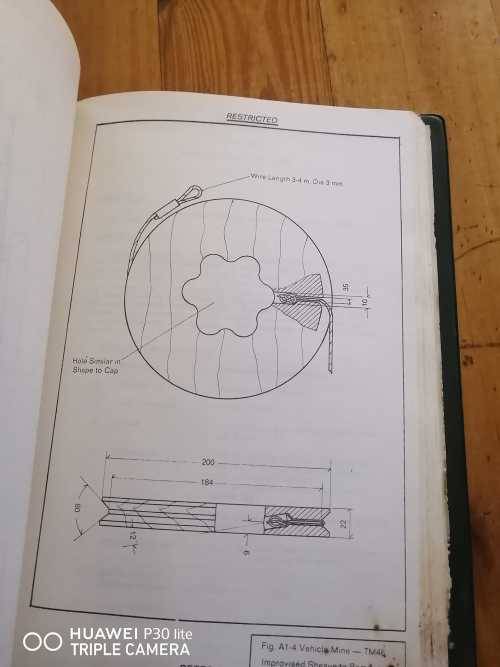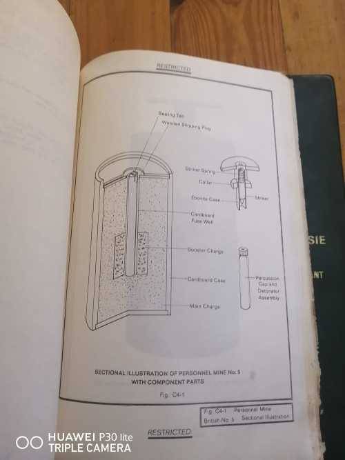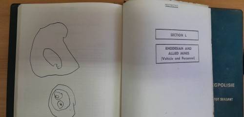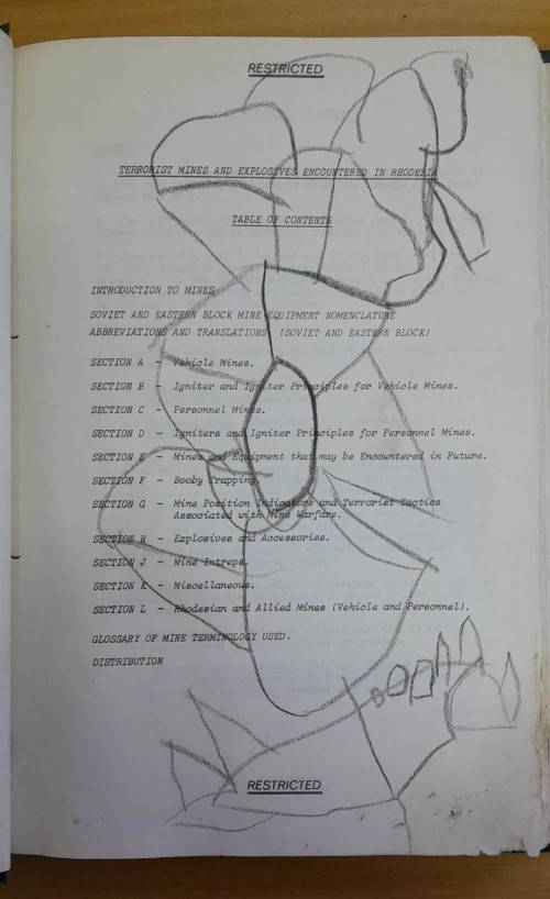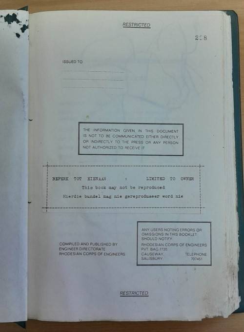 Large (A4) Rhodesian Corps of Engineers RESTRICTED manual featuring details of assorted Soviet, Chinese and 'other' explosives encountered during the Bush War. Of interest is that this copy appears to have made its way south and been used by the South Africans, with a repurposed SARP file. Un-numbered but thick! Very good, field-used condition with some stains, light insect damage to a few pages and random art works by a family member.