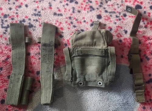 Webbing used by a Rhodesian officer (all from same source) who served in the BSAP, RAR and later in the SADF where he eventuallly retired as a Colonel. Includes the elusive compass holder. Very nice Southern Rhodesia Govt. triangular stamp inside the bino. pouch, a partial on one of the FN bayonet frogs. Name of the officer will be supplied to winning bidder. All in an excellent condition, as pictured. Paypal and overseas postage available. Postnet R119.00.