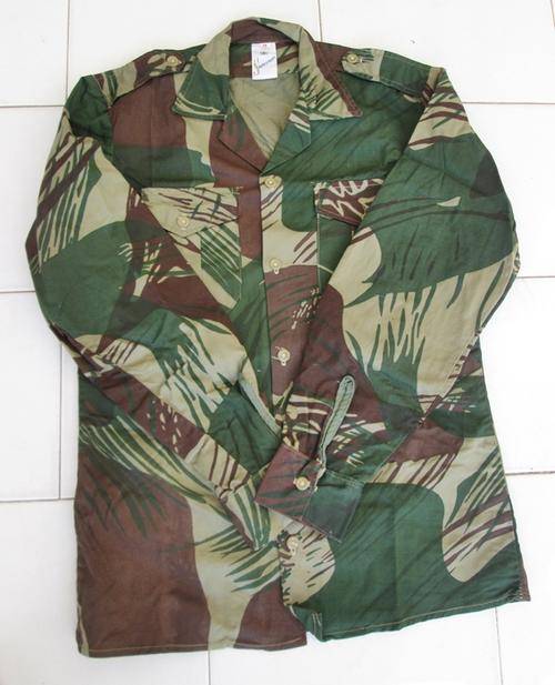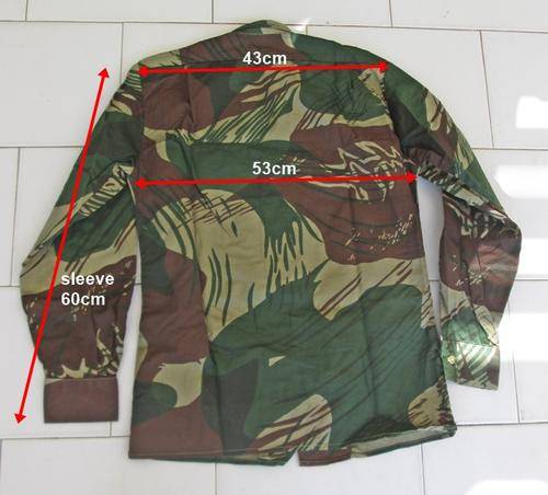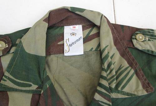 RHODESIAN CAMO LONG SLEEVE SHIRT MANUF. LABEL STATESMAN SIZE 14. MEASURES ARMPIT TO ARMPIT 53CM. SHOULDER TO SHOULDER 43CM. CONDITION: NEW - UNISSUED
