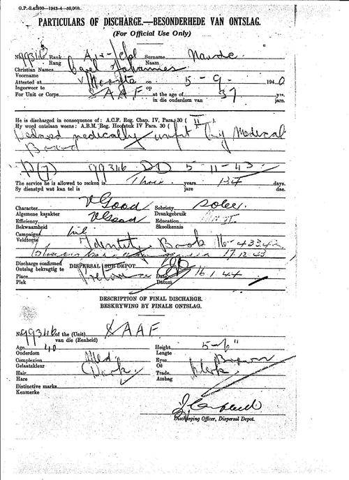 SAAF on 5 Sept 1940. Married with two children. T.A. Cpl Naude was released âÂÂMedically Unfit and discharged on 5 Nov 1943. Awarded the TR Service medal when he was in his 60’s.
