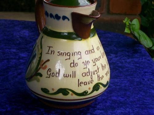 MEASURING 17.5 CM HIGH AND 14 CM FROM HANDLE TO SPOUT. NOTE: THERE IS DAMAGE TO LID AS CAN BE SEEN IN THE PHOTO AND A SMALL CHIP TO THE RIM.