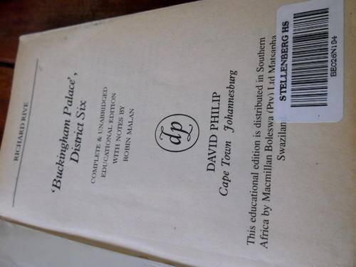 District Six'' is a rich, rather old-fashioned hymn to the community - as Richard Rive remembers - as a boy grewing up in District Six in the 1950's. The story focuses on the denizens of ''a row of five mouldy cottages called 'Buckingham Palace' by the locals'' .with notes by Robin Malan.