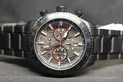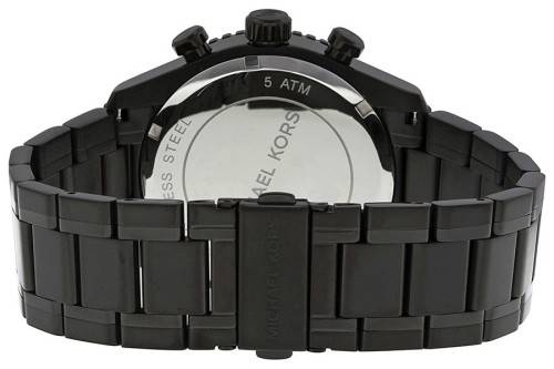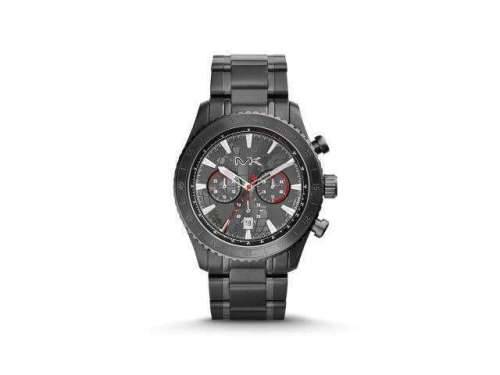 Gunmetal ion-plated stainless steel case and bracelet. Fixed gunmetal ion-plated bezel. grey dial with luminous skeleton hands and index hour markers. Minute markers. Tachymeter around the outer rim. Dial Type: Analog. Luminescent hands and markers. Date display at the 6 o'clock position. Chronograph - three sub-dials displaying: 60 second, 30 minute and 24 hour. Quartz movement. Scratch resistant mineral crystal. Push / pull crown. Solid case back. Case diameter: 45 mm. Case thickness: 14 mm. Round case shape. Band width: 24 mm. Deployment clasp. Water resistant at 50 meters / 165 feet. Functions: chronograph, tachymeter, date, hour, minute, second. Casual watch style. Michael Kors Richardson Steel Chronograph Grey Dial Mens Watch MK8352.