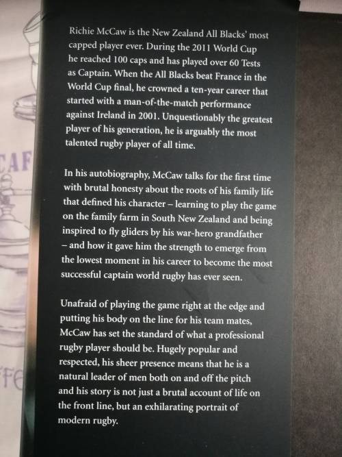 From Goodreads ; Richie McCaw is the New Zealand All Blacks’ most capped player of all time. During the 2011 World Cup he reached 100 caps and has played over 60 Tests as Captain. When the All Blacks beat France in Final, he crowned a ten year career that started with a man-of-the-match performance against Ireland in 2001. Unquestionably the greatest player of his generation, he is arguably the most talented rugby player of all time.