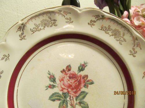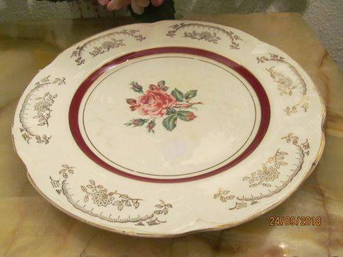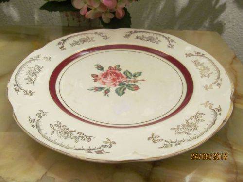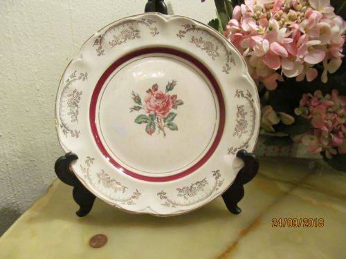THIS ITEM IS A VINTAGE DINNER SIZE DECORATIVE WALL / CABINET PLATE DESIGNED WITH A SCALLOPED RIM WITH GOLD TRIM AND DEPRESSED PANELS CRAFTED ALONG THE VERGE. THE PATTERN DECORATING THE PLATE WAS KNOWN AS THE BYRON PATTERN AND IT DEPICTS GOLD LEAF AND FLORAL WITHIN EACH PANEL AND A GORGEOUS PINK FLORAL ROSE PATTERN IN THE CENTER FRAMED BY A RED BAND