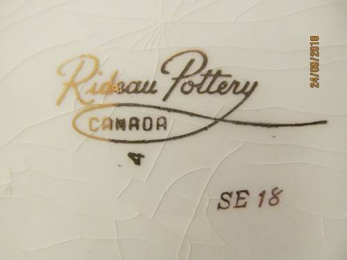 STAMPS/MARKS ETC : THE ITEM IS STAMPED UNDERNEATH IN GOLD - "RIDEAU POTTERY, CANADA, SE 18"