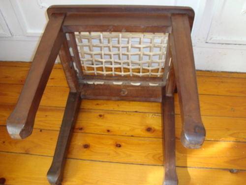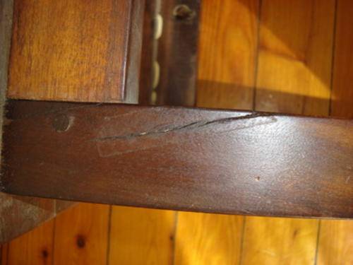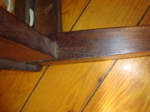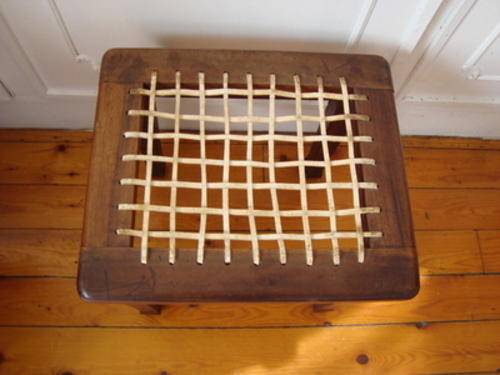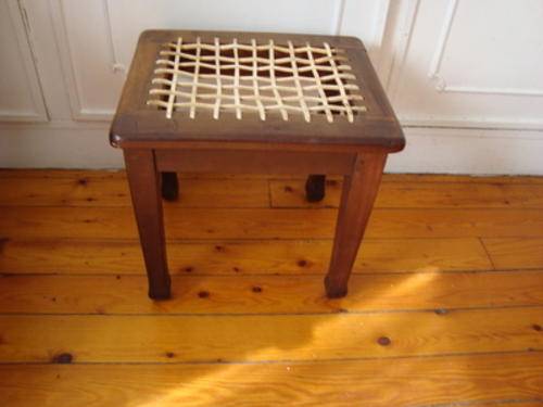Sturdy riempie stool, in good condition,measures 345mm x 365mm x 310mm.I do not know wood types but I think it is teak???.thereis a small crack at the top of the one leg but this does not affect the stool at all.