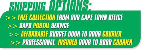 R65.00 Standard shipping applies to orders under R100.00, in most areas in South Africa. R35.00 Standard shipping applies to orders over R100.00. Some areas may attract a surcharge surcharge. This will be calculated at checkout if applicable. Check my rate