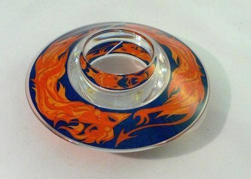 It is simple but amazingly clever for the wax candle in its low position sends its light through the solid glass to illuminate the decorations. The image's brilliance is thus further enhanced and the colorful motifs come into their own even in the dark.