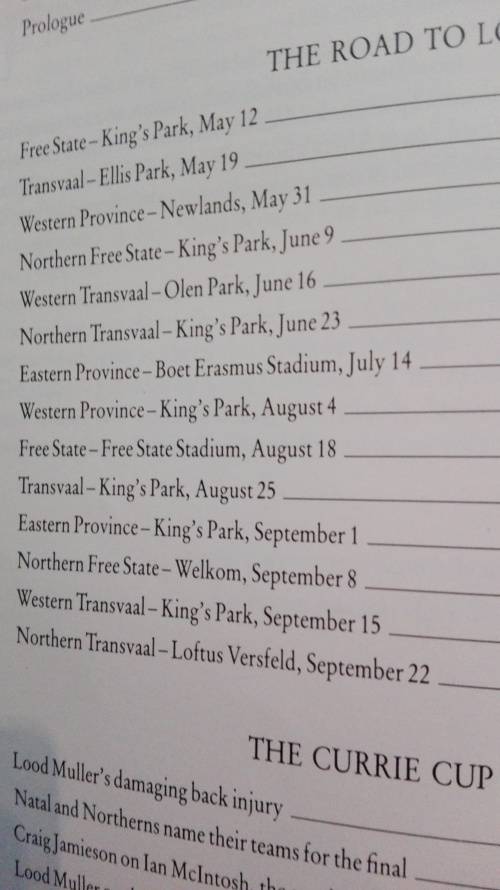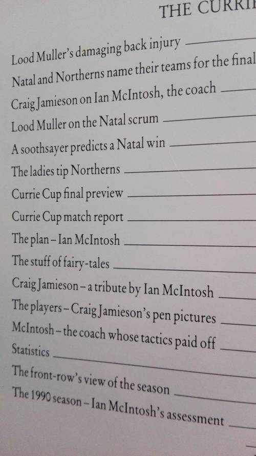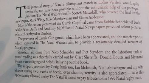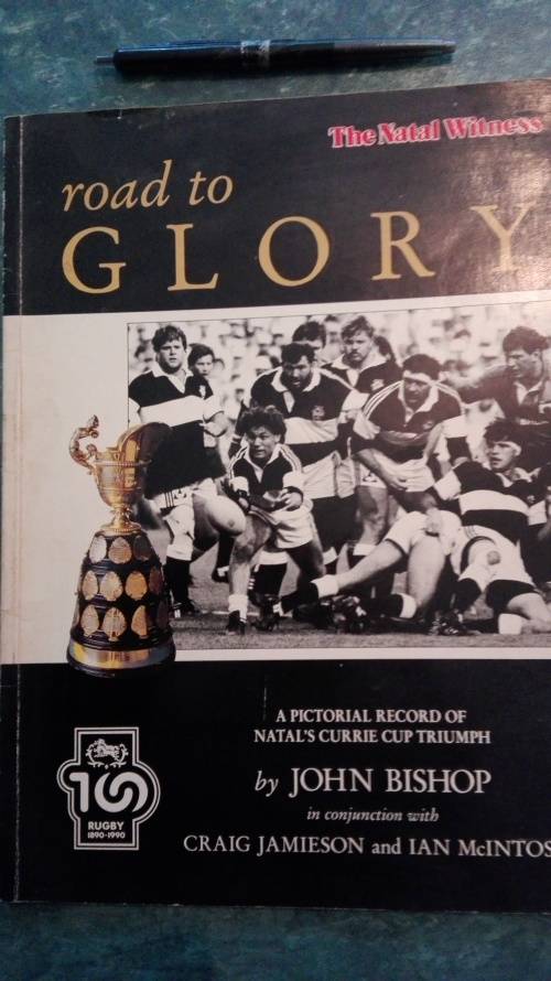 Road to GLORY : A Pictorial Record of Natal's Currie Cup Triumph (1990 ) by John Bishop in conjunction with Craig Jamieson and Ian McIntosh; published by The Natal Witness . ISBN 0 620 15357 1 This is a First Edition, First impression 1990 with 72 pages with commentry , black and white and a few colour photographs .