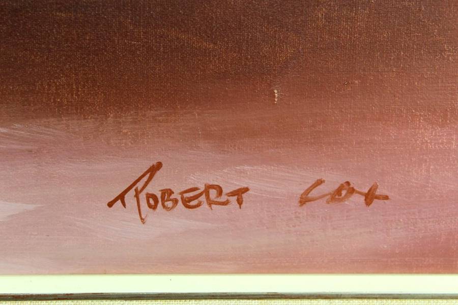 An absolutely stunning painting by Robert Cox in his signature style. The colors are so fresh and vibrant they seem to jump of the canvas. It is an oil painting measuring 90cm x 60cm and the frame measures 104cm x 73cm. Do not loose out on this one, bid now!!
