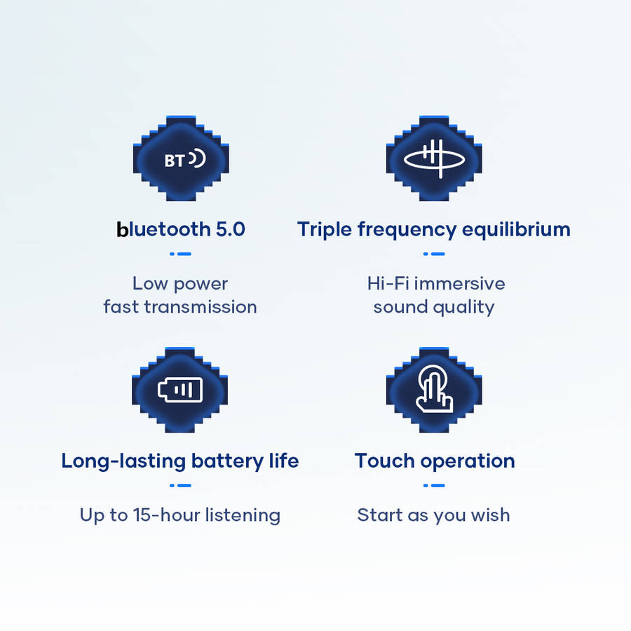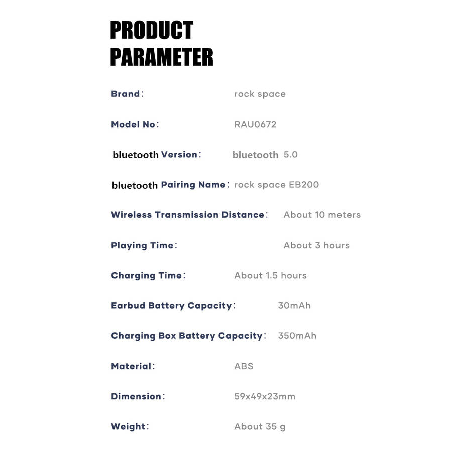 Features: -bluetooth 5.0 chip: lower power consumption, more stable. -HiFi high fidelity sound surging heavy bass. -Large capacity life, equipped with a charging box of a 350mAh capacity. Specifications: Brand: Rock space Model: RAU0672 bluetooth Version: bluetooth 5.0 bluetooth Pairing Name: Rock space EB200 Wireless Transmission Distance: About 10 meters Playing Time: About 3 hours Charging Time: About 1.5 hours Earbud Battery Capacity: 30mAh Charging Box Battery Capacity: 350mAh Material: ABS Dimension: 59x49x23mm Weight: About 35 g Package Included: 1 pair * ROCK Wireless Earphones 1 * USB charging cable? 1 * User Manual
