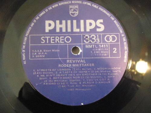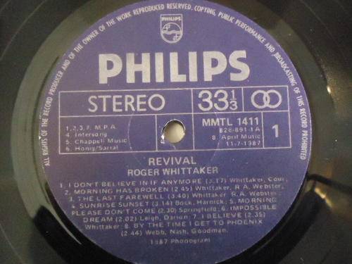 On offer is this ROGER WHITTAKER "REVIVAL" 1987 PHILIPS STEREO LP IN EXCELLENT CONDITION WITH 1 SLIGHT HAIRLINE MRK ON THE VINYL