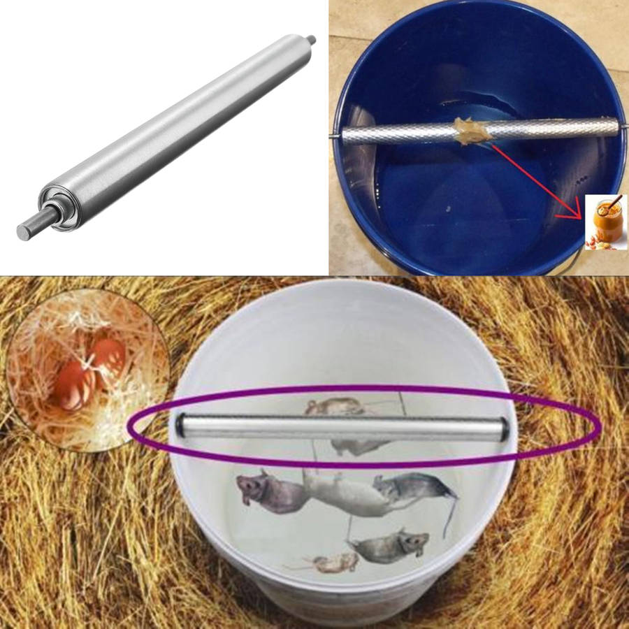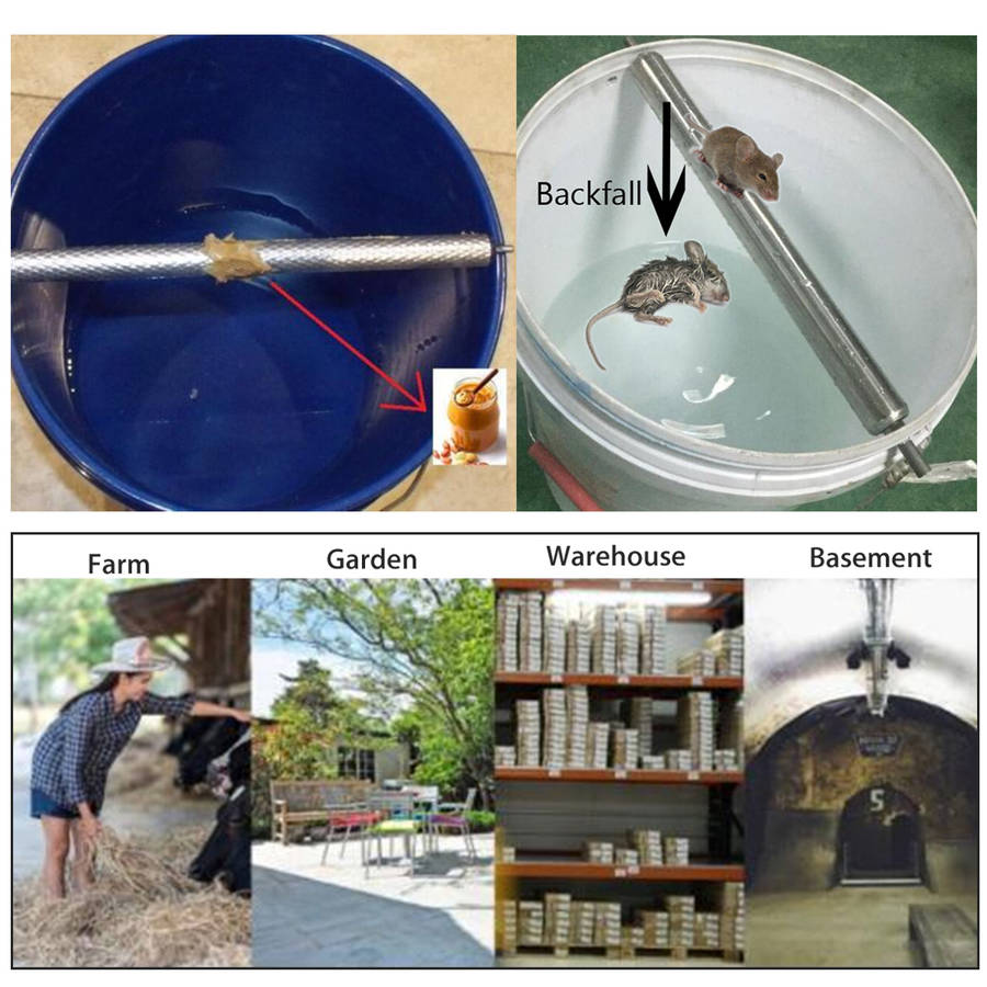 Use Instructions: 1.Drill 2 holes on opposite sides of the bucket. 2.Insert both ends of the 'Rolling Mouse Trap' into the holes 3.Check that trap spins freely 4.Add ramps on either side of the bucket in order for the mice to climb up to reach the bait. Fill bucket half way up with water 5.Add bait to center of the trap