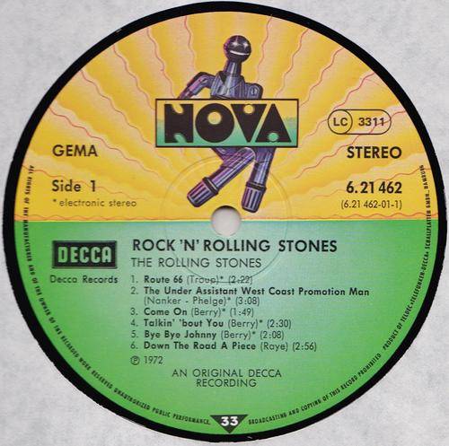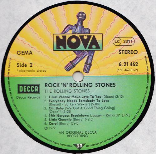 1972 German NOVA-RECORDS pressing, release number 6.21462 AO, of album by The ROLLING STONES: ROCK 'N' ROLLING STONES. The track details are as shown on the images provided. The record has a few extremely faint and barely visible, ineffective sleeve-scratches, is in a hardly played, excellent plus condition. The cover has very lightly scuffed corners and edges, with the bottom corners being lightly bumped as well, plus some ring-wear at front & back, otherwise in a near excellent shape. |
