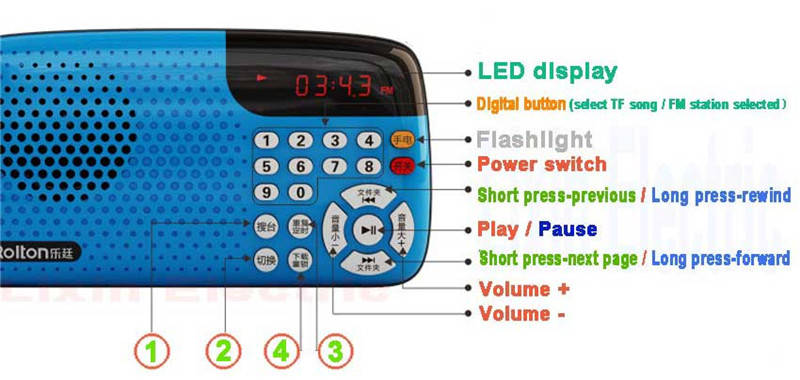 | Basic function | Music/FM/Flashlight/Audio-In Jack |