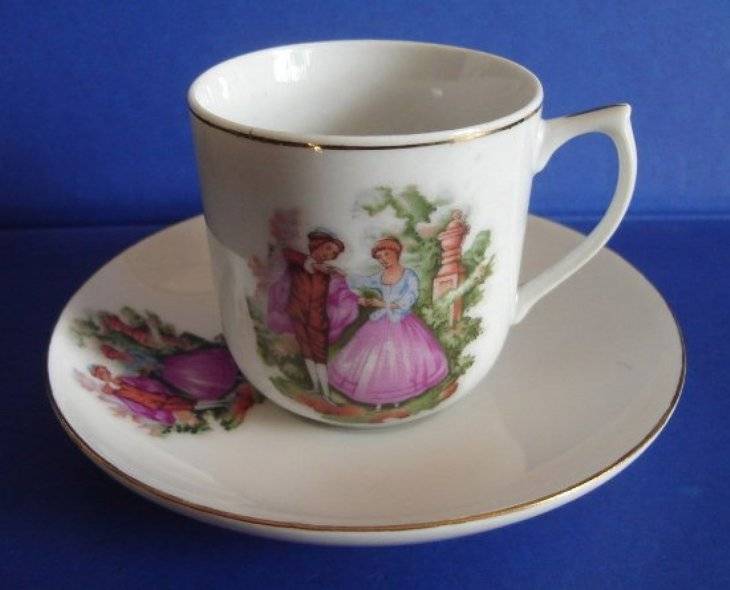 A BEAUTIFUL GOLD RIMMED ROMANTIC SCENE CUP ( height 60mm ) and SAUCER ( diameter 115mm ).IN GOOD CONDITION, MARKED CHINA TO BASE.