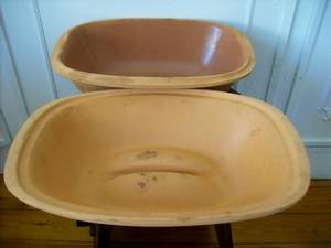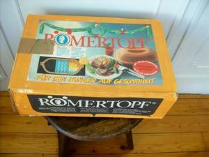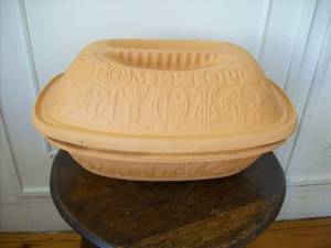 Romertopf cooking dish in its original box. This dish is numbered 111 for 2-6 persons 2,5 kg. It has an instruction booklet with it. The dish is in almost new condition, but has 2 marks on the lid which will not affect anything cooked therein.