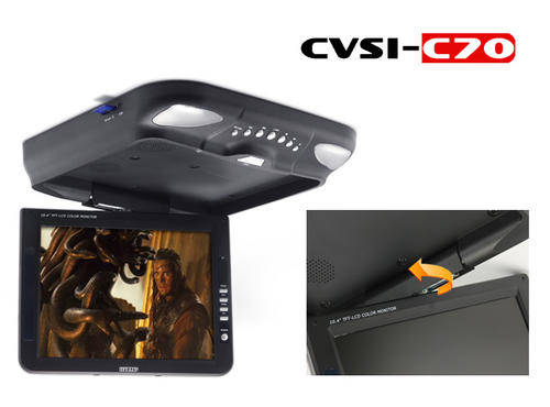This roof mounted vehicle audio and visual entertainment system features a 10.4 inch TFT LCD display with amazing 800x600 pixel resolution for vibrant color and crystal clear picture quality. This high brightness LCD screen can be rotated 90 degrees to the left or right, so it is in the perfectly position for everyone in the car to enjoy a good time.