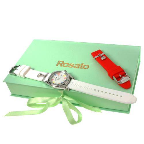 item Watch original brand name Rosato collection happyness condition brand new functions date model rt27478-001 movement quartz Dial: material mother of pearl color white quantity 1 shape inlay interchangeable straps Watch Bracelet: material rubber color white max length 8.5 inch min length 6.5 inch Watch Case: diameter 40 mm height 9 mm material stainless steel with gold inlay color silver water resistant 3atm gemstone info: gemstone crystal shape round