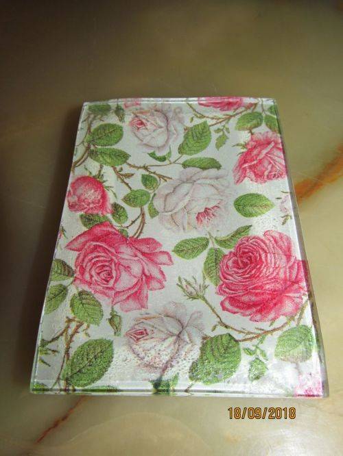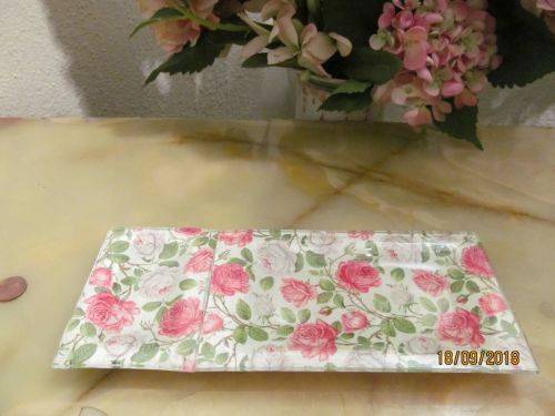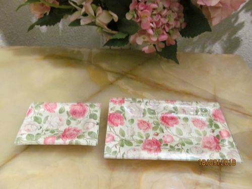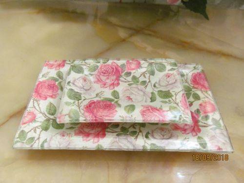 A PAIR OF VINTAGE DESIGNER ART GLASS ITEMS WHICH CAN BE CONSIDERED UNIQUE IN THAT EACH OF THE TWO IS HAND MADE AND DECORATED WITH A BEAUTIFUL ROSE PATTERN WITH SNOW WHITE ROSES DEPICTED ENCIRCLED BY PINKS WITH A SERIES OF EMERALD GREEN LEAVES. THE ITEMS ARE MOLDED GLASS WITH THE PATTERN FORMED UNDERNEATH ALONG WITH FOUR HAND BLOWN FEET ATTACHED. THE ITEMS ARE DECORATIVE AND FUNCTIONAL SPOON AND TEA BAG RESTS RESPECTIVELY