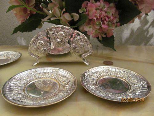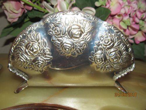 THE SERVIETTE STAND IS CRAFTED IN A DOUBLE DEMI-LUNE STYLE SHAPE WITH THE BASE EXTENDED TO CREATE A STAND. BOTH SIDES OF THIS ADORABLE ITEM ARE DECORATED IN A SERIES OF THREE ROSE BOUQUETS CONSISTING OF THREE ROSES IN EACH BOUQUET, ALL IN REPOUSSE CRAFT