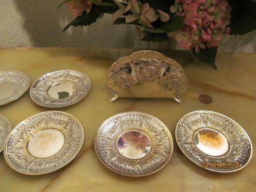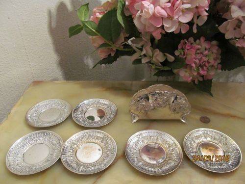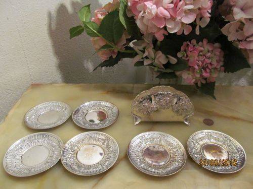 VINTAGE LOT OF SILVER PLATED SERVIETTE STAND AND SET OF SIX IDENTICAL BUTTER PAT/TRINKET/NUTS DISHES