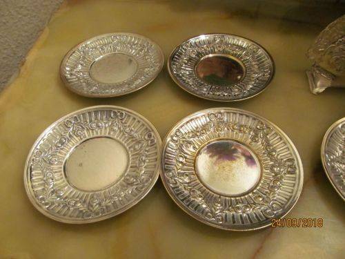 THE SET OF SIX CIRCULAR BUTTER PAT / TRINKET / NUTS DISHES ARE ALL IDENTICAL WITH EACH BEING GRACEFULLY DECORATED IN A ROSE GARLAND PATTERN SET AGAINST A FLUTED DESIGN ALONG THE VERGE EACH IN DETAILED REPOUSSE CRAFT