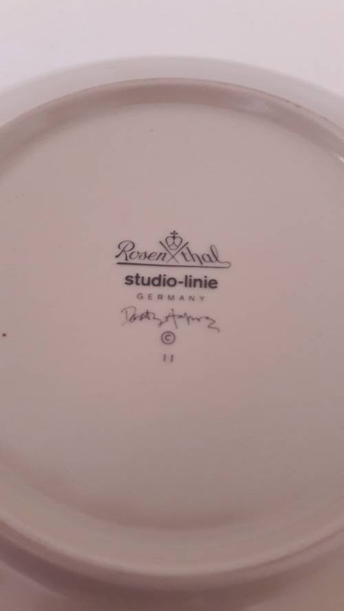 Offered for sale is a collectible, hard to find Rosenthal Germany porcelain platter from the Flash series by American celebrity designer Dorothy Hafner. This range was introduced in 1982 and has been out of production for decades.It is a porcelain bodied platter with a pale cream coloured over glaze and vibrant post-modern Memphis inspired coloured border , transfer printed with decals. The piece is signed on the back with the designers facsimile signature , the Rosenthal Studio line imprint and the pattern number. Rosenthal was one of the first world famous porcelain manufacturers to commission designs for tableware and vases from celebrity designers of which Gianni Versace is probably the best known. Dorothy Hafner is an American artist, painter and sculptor who started designing ceramics in 1973. She has produced tableware collections for Rosenthal, Tiffany and Co and Neiman Marcus. Her ceramic designs have been acquired by the Smithsonian Museum as exemplars of cutting edge modern design. Item listed is one of two pieces available (this is the smaller item).