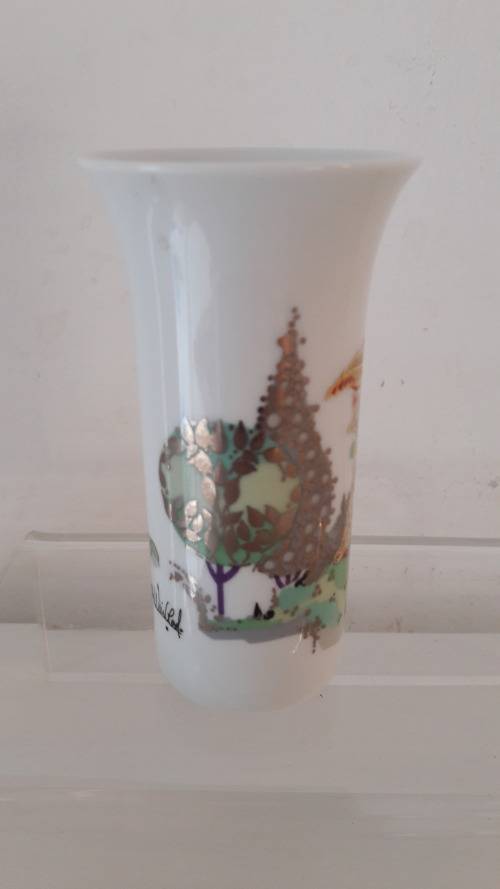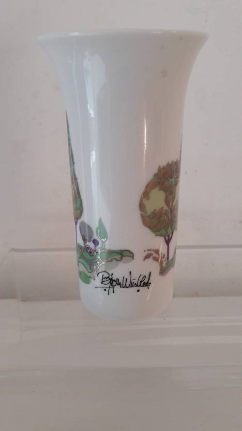 Offered for sale is a charming small Rosenthal bud vase or posy vase decorated by Danish master designer Bjorn Wiinblad for the Studio Line/artistic ware division of Rosenthal and dating to circa the 1970's. The vase has an understated cylindrical form slightly tapering towards the top with a convex rim. The decorative motif is a seated minstrel playing a harp in an idyllic bower or treed landscape. The image is decal or transfer printed and hand painted in vibrant colours with extensive gold and silver gilt. The vase is signed in the image with the artists facsimile signature in black.