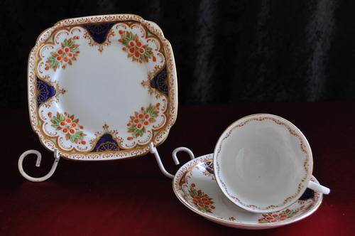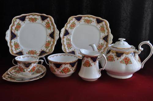 10 x Trio's, 2 x Cake plates, 1 x Milk jug, 1 x Sugar bowl and 1 Tea pot.