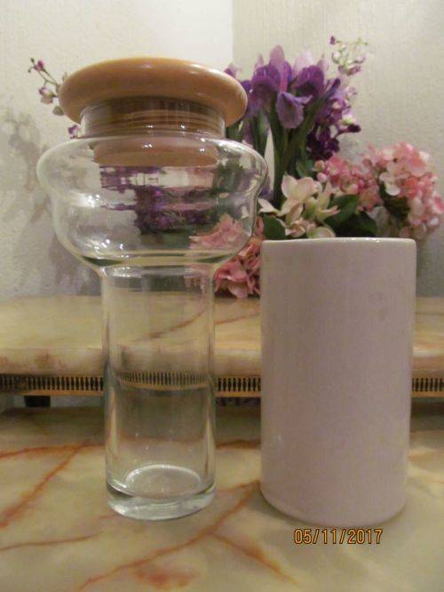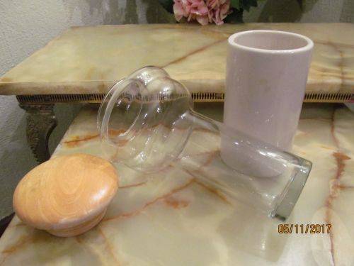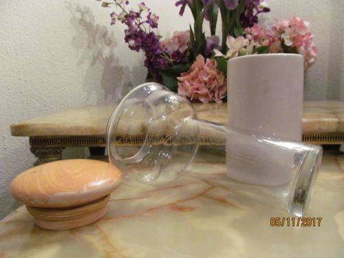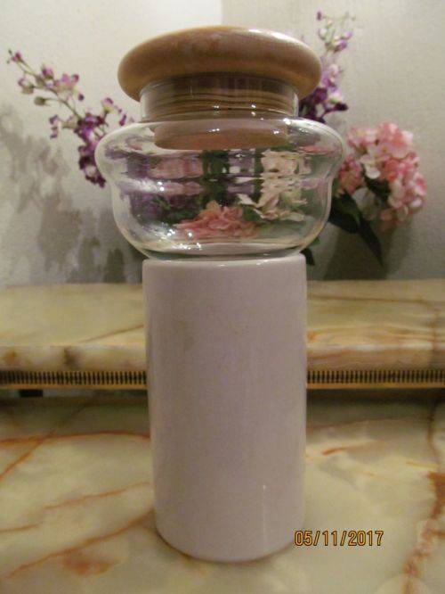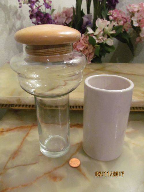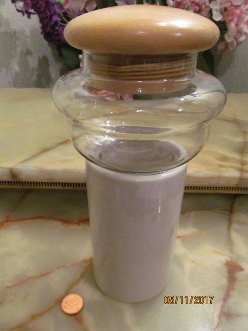 1)- AN UNUSUAL GLASS STORAGE CONTAINER / JAR WITH A CARVED WOOD LID. THE WOODEN LID HAS A WOOD COLOR RUBBERIZED PORTION PERMITTING IT TO FIT SECURELY INTO THE GLASS CONTAINER / JAR. THE GLASS THEN FITS INTO A CYLINDRICAL CERAMIC HOLDER (Pls see pics as this is an unusual item).