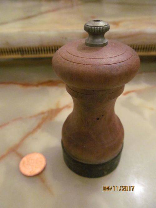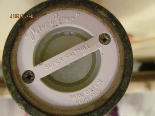 STAMPS/MARKS ETC : THE UNUSUAL ITEM IS NOT STAMPED OR MARKED WHILE THE SALT MILL IS MARKED IN RAISED LETTERS UNDERNEATH - "PETER PIPER, SUPER SALT MILL, PARK GREEN, ENGLAND"