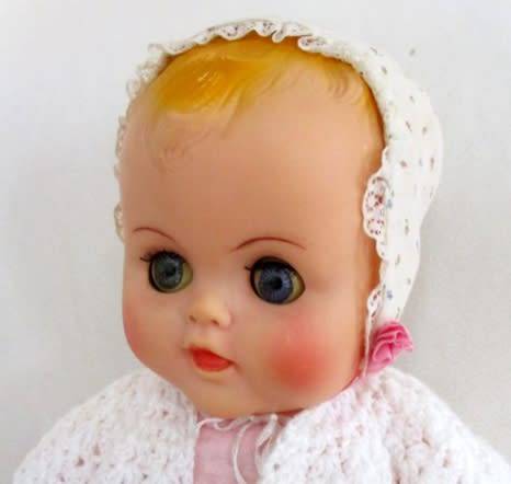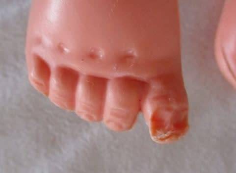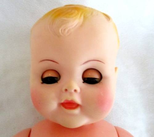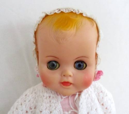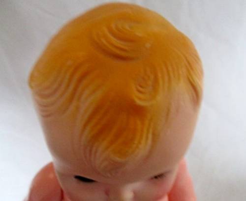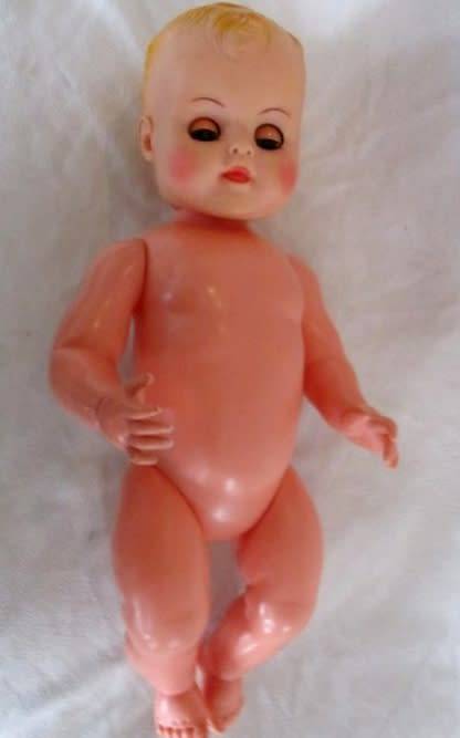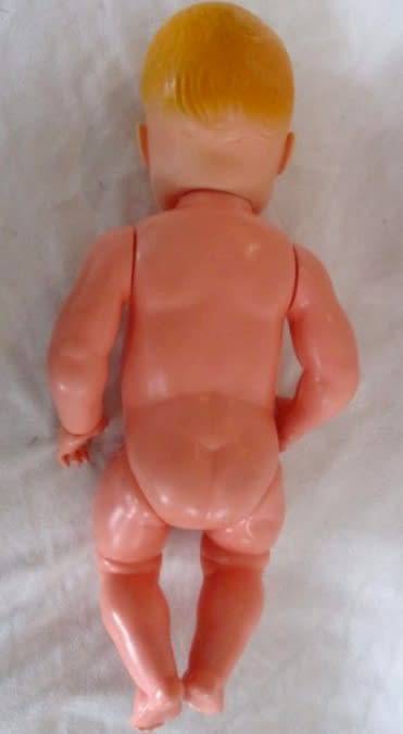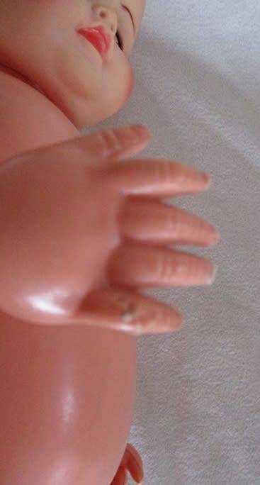 48CM TALL AND JUST TOO BEAUTIFUL! SHE HAS A FEW INSIGNIFICANT, HARDLY NOTICEABLE NIBBLES TO THE TIPS OF HER FINGERS BUT NOTHING MAJOR AND ONE BIG TOE ALSO HAS NIBBLES (LAST TWO IMAGES) OTHER THAN THAT SHE IS IN VERY GOOD CONDITION AND SUCH A SPECIAL, RARE DOLL! MARKED 'EVERGREEN MADE IN HONG KONG 1200' ON BACK REFER IMAGES