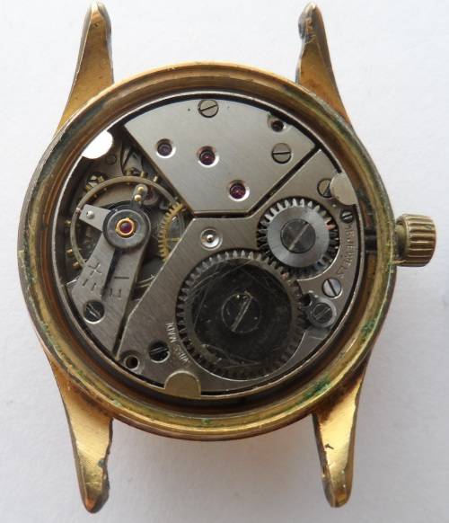 Rotary Manual Watch, diameter: +- 30mm. Not running, for spares/repairs, parts might be missing? No strap.Watch has some wear/marks/scratches. Crown rotates, hands move. Movement marked: 15 Jewels Swiss Made.