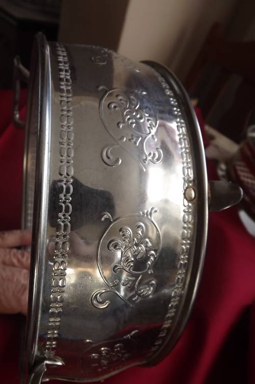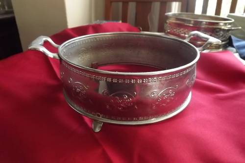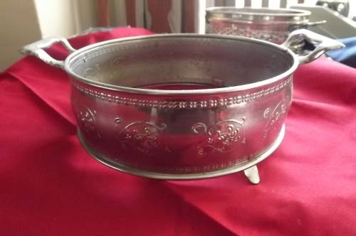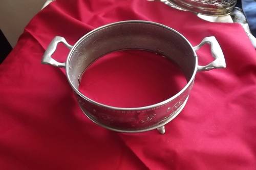 Round chrome plated pot stand with handels.On 4 feet.Good condition. 19 cm diameter.