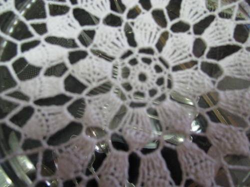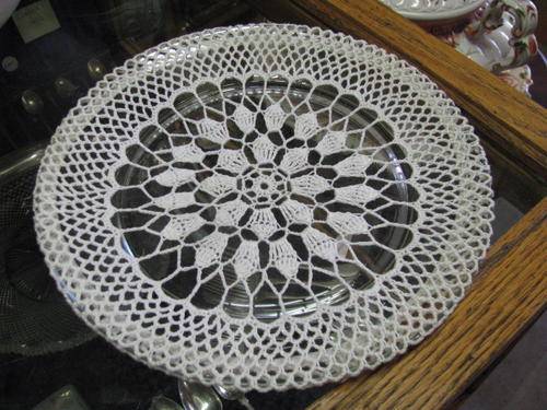 A GLASS PLATE WITH REALLY PRETTY FINELY CROCHETED COVER