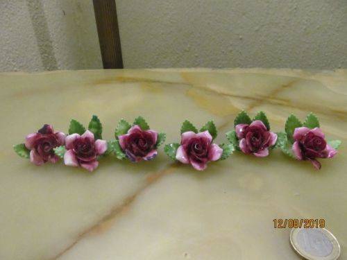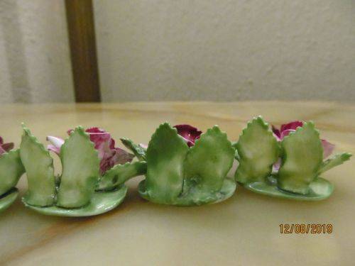 INTRICATE DETAIL COMBINED WITH REALISTIC BEAUTY COMPRISE THIS SET OF SIX VINTAGE HAND PAINTED ROYAL ADDERLEY FINE PORCELAIN ROSE PLACE HOLDERS / MARKERS MANUFACTURED DURING THE 1950's AS PART OF ROYAL ADDERLEYS FLORAL CHINA RANGE. EACH ITEM IS CRAFTED IN PRECISION TO DEPICT A BEAUTIFUL WINE RED ROSE WITH DEEP PINK PETALS NESTLED UPON SHAMROCK GREEN LEAVES WITH TWO FORMING THE CARD REST