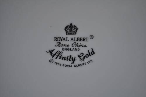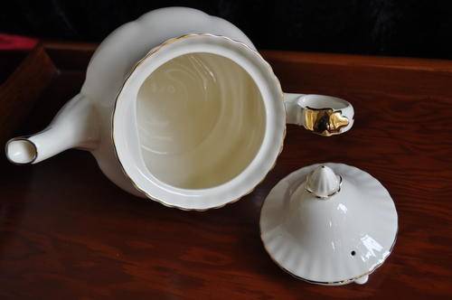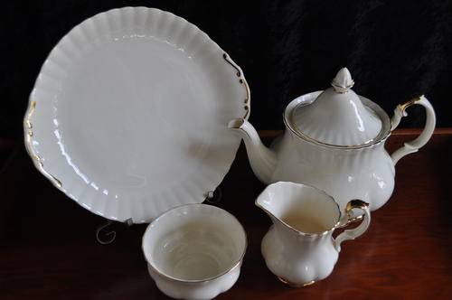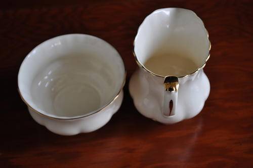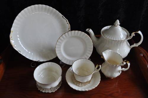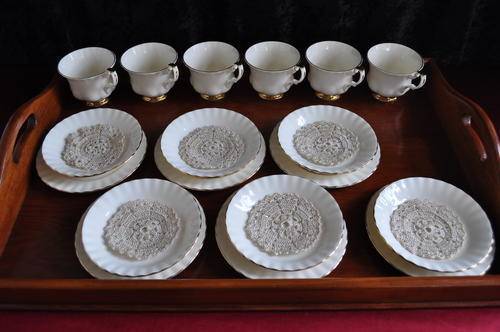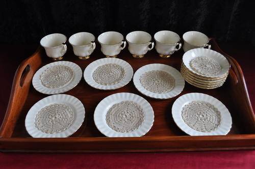 If you have an affinity for gold, this set has your name on it!!! It is cream in colour and in new condition, note that all the saucers and side plates comes with crocheted doilies. This is truly a must have.